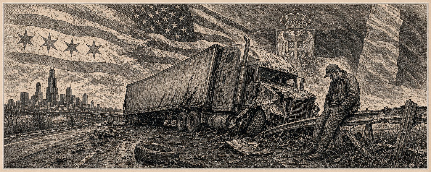 This is the story of an American trucking ecosystem that grew up over twenty-seven years between metropolitan Chicago, Naples, Miami, Cincinnati, Buckeye, Belgrade, and Kragujevac. It is a story about corporate succession at a single truck yard in Justice, Illinois, about captive insurance and captive factoring, about the relationship between a revoked federal motor carrier and the rental company that now owns its equipment, about federal civil racketeering complaints that got dismissed on procedure without ever being tested on the merits, about an ambassador nominee who died two months after his nomination was withdrawn, and about a homicide investigation in Shelby County, Ohio whose discovery file contains the clearest single piece of documentary evidence I have ever seen in fifteen years of working commercial motor carrier cases.