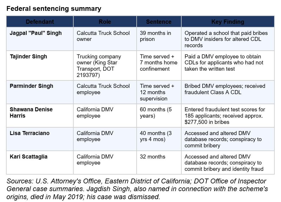 The school-side operator at the center of federal prosecution was Jagpal Singh, owner of Calcutta Truck School in North Hollywood. In December 2019, the U.S. Attorney’s Office announced that Singh was sentenced to more than 3 years in federal prison for bribing DMV employees to issue commercial driver’s licenses to unqualified drivers. Prosecutors said he paid to have DMV records altered so applicants appeared to have passed tests when they had not.