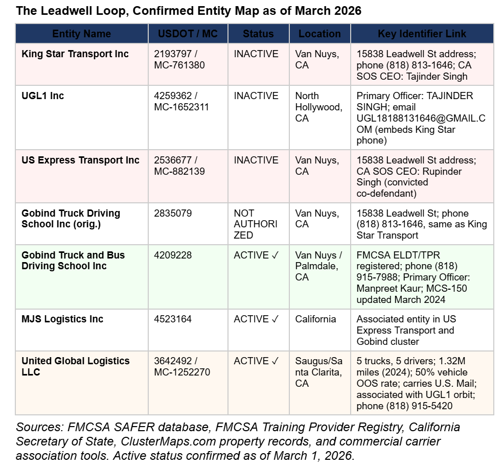 The Leadwell Loop is not a metaphor. It is a physical address, a phone number, a family of entity names, and a set of federal carrier registrations that, taken together, document how a prosecuted CDL fraud ecosystem reorganized and continued operating in public view after the case was closed.