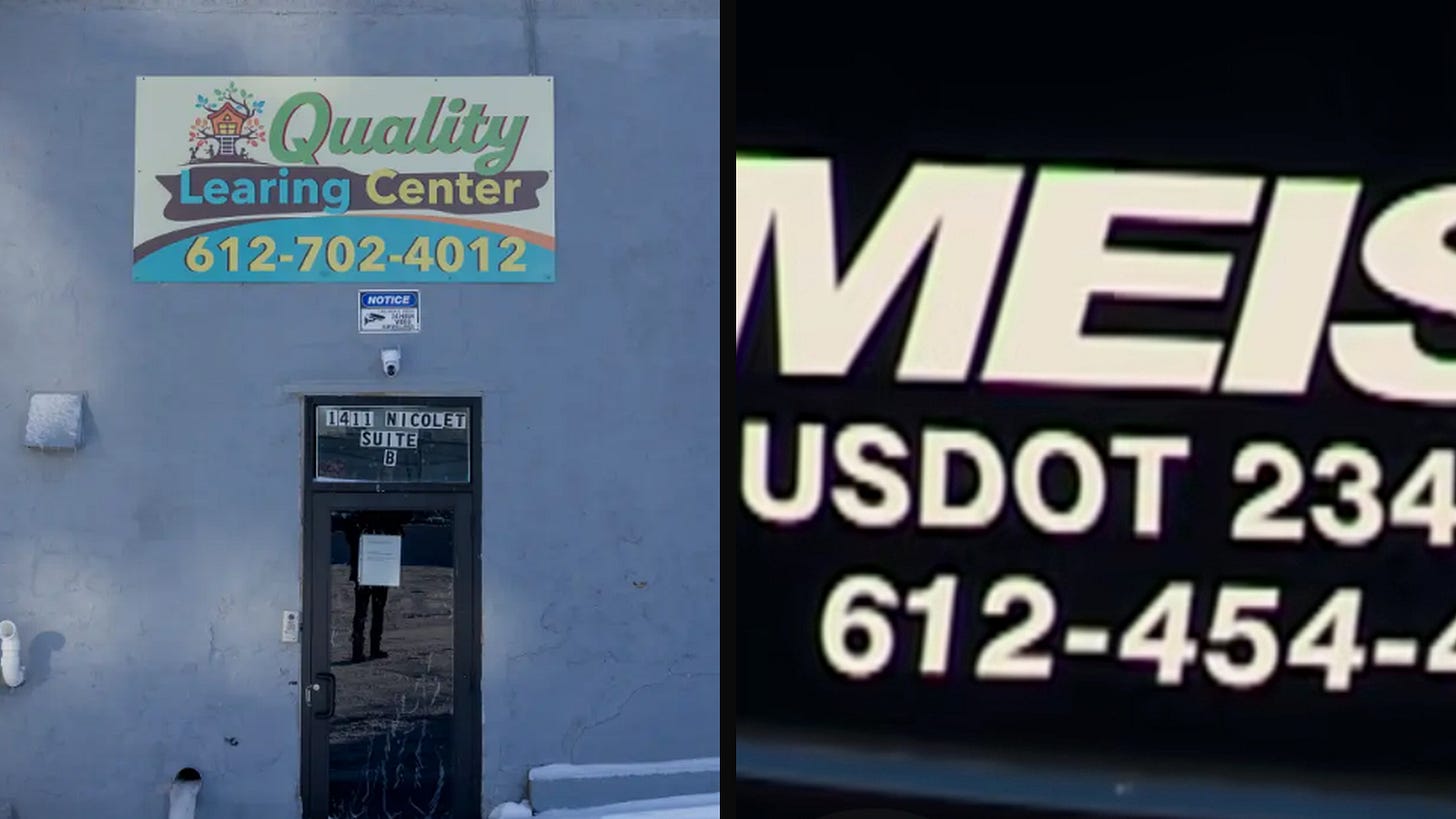 MEISA Transportation Services LLC vehicles were among those that arrived at Quality Learning Center and other Minneapolis-area daycares on Dec. 29, dropping off dozens of children shortly before state auditors conducted site visits. The daycares had mainly appeared empty in viral video footage recorded days earlier by independent journalist Nick Shirley.