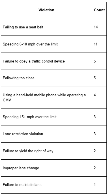 Speeding, phone use, following too closely, and running red lights are the violations that cause crashes. While none resulted in OOS orders (these typically don’t under current rules), they paint a picture of driver behavior that matches the maintenance culture: minimum standards, maximum risk.