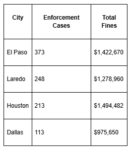 El Paso, with a metro population of 870,000, has more enforcement cases than Houston (7 million metro) and Dallas (7.6 million metro) combined.