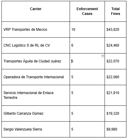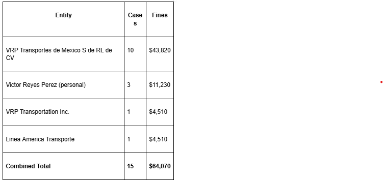 VRP isn’t alone at the top of the enforcement list. The El Paso corridor has produced a network of carriers with multiple enforcement cases: