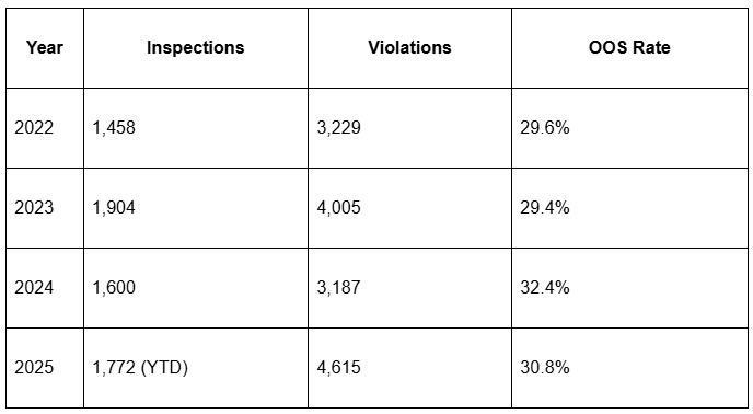Notice something? The violation rate isn’t getting better. In fact, 2024 saw the highest OOS rate in the four years at 32.4%. That’s after years of enforcement cases and tens of thousands in fines.