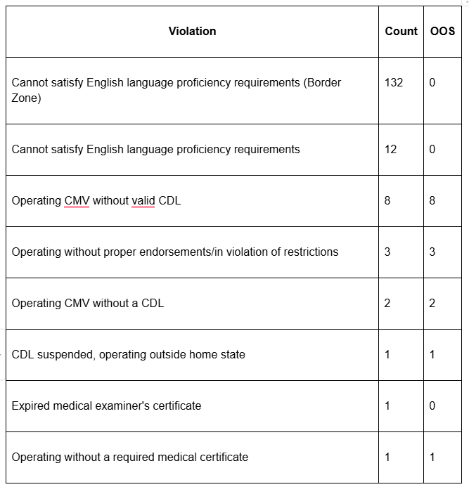 Eleven drivers were caught operating without a valid CDL or with improper endorsements. Every single one of those was placed out of service, because they literally weren’t qualified to be behind the wheel.