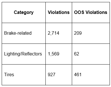 Underinflated/Leaking Tires, 363 violations (all 363 were OOS)