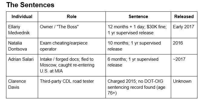 Six hundred people received fraudulent Florida CDLs through Larex. Many couldn’t speak English. Many had never driven a commercial vehicle. Florida sent warning letters to 2,000+ CDL holders and gave them 60 days to retest.