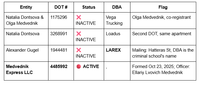The LAREX DBA carrier (DOT 1944481, Alexander Gugel) warrants separate investigation, using the name of a federally convicted fraud operation as a DBA is not an accident