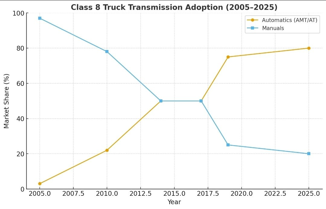 The transformation happened at breakneck speed. In 2005, automatic transmissions represented a mere 2-5% of Class 8 truck sales. By 2017, the split was 50-50. Today, you'd be hard-pressed to find a manual transmission in a new long-haul tractor. Almost every file we review has a manual restriction.