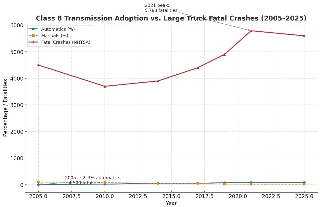 In 2005, when 95% of Class 8 trucks rolled with manual transmissions, America recorded approximately 4,500 fatal crashes involving large trucks. Fast-forward to 2021's peak of 5,788 fatalities, a 29% increase, and you'll find that manual transmissions had all but disappeared from new truck sales, replaced by automatics in 75-80% of the fleet.