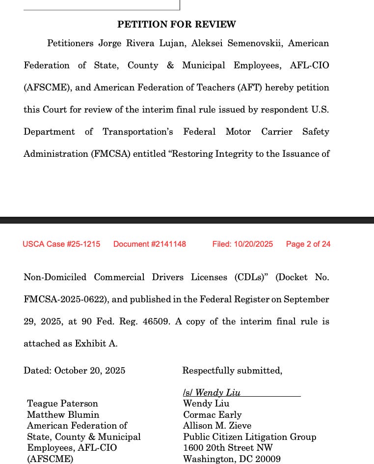 A peculiar legal challenge has emerged in the D.C. Circuit that’s raising eyebrows in transportation law circles. On October 20, 2025, workers and unions filed a petition challenging the Department of Transportation’s controversial rule restricting commercial driver’s licenses for certain immigrants, but the lead challengers aren’t the Teamsters or traditional trucking unions. Instead, it’s the American Federation of Teachers (AFT) and the American Federation of State, County & Municipal Employees (AFSCME) spearheading the fight.