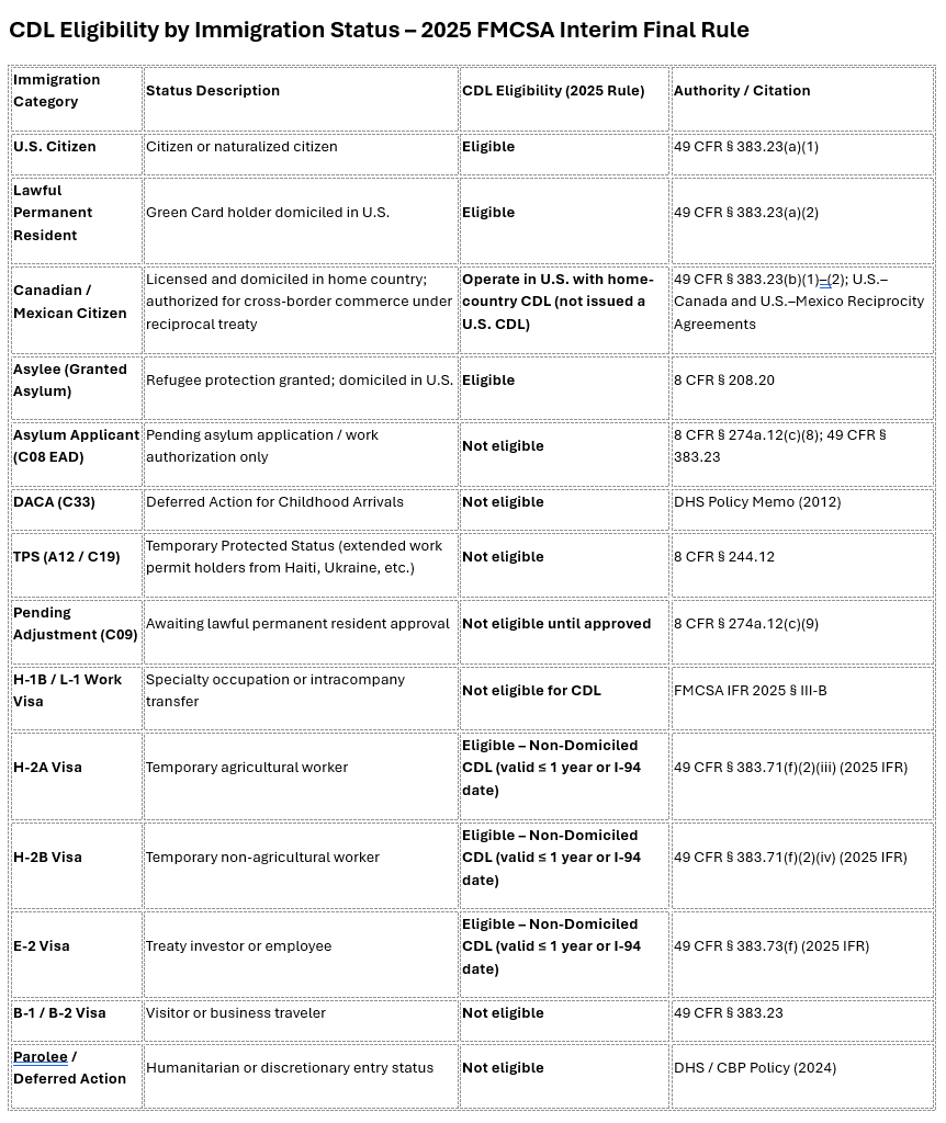 The DOT’s interim final rule, titled “Restoring Integrity to the Issuance of Non-Domiciled Commercial Drivers Licenses,” was published and took effect on September 29, 2025. The rule dramatically restricts who can obtain nondomiciled CDLs, licenses issued to individuals who don’t reside within a state’s borders.